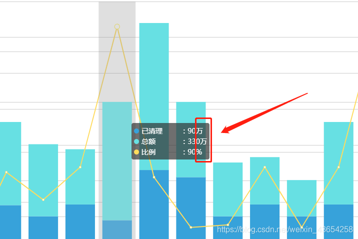 // 设置echarts中的formatter参数 formatter: function(a) { let list = []; let listItem = ""; for (var i = 0; i < a.length; i ) { if (i < 2) { list.push( '<i style="display: inline-block;width: 10px;height: 10px;background: ' a[i].color ';margin-right: 5px;border-radius: 50%;}"></i><span style="width:70px; display:inline-block;">' a[i].seriesName "</span>  :" a[i].value "万" ); } else { list.push( '<i style="display: inline-block;width: 10px;height: 10px;background: ' a[i].color ';margin-right: 5px;border-radius: 50%;}"></i><span style="width:70px; display:inline-block;">' a[i].seriesName "</span>  :" a[i].value "%" ); } } listItem = list.join("<br>"); return '<div class="showBox">' listItem "</div>"; },