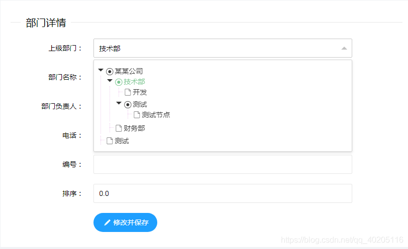 <meta charset="UTF-8" /> <style type="text/css"> .myData .layui-form-item{ margin: 20px 100px 10px 45px; } .myData .layui-form-label{ width: 85px; } .layui-input-block { margin-left: 120px; } </style> <form class="layui-form myData" action="save" method="post" lay-filter="stuform"> <div class="layui-form-item"> <label class="layui-form-label">上级部门:</label> <div class="layui-input-block"> <input type="text" name="parentId" id="tree2" lay-filter="tree2" class="layui-input" /> </div> </div> <div class="layui-form-item"> <label class="layui-form-label">部门名称:</label> <div class="layui-input-block"> <input type="text" name="name" lay-verify="required" class="layui-input" /> </div> </div> <div class="layui-form-item" > <label class="layui-form-label">部门负责人:</label> <div class="layui-input-block"> <input type="text" name="deptName" class="layui-input" /> </div> </div> <div class="layui-form-item" > <label class="layui-form-label">电话:</label> <div class="layui-input-block"> <input type="text" name="phone" class="layui-input" /> </div> </div> <div class="layui-form-item" > <label class="layui-form-label">编号:</label> <div class="layui-input-block"> <input type="text" name="number" class="layui-input" /> </div> </div> <div class="layui-form-item" > <label class="layui-form-label">排序:</label> <div class="layui-input-block"> <input type="text" name="idx" value="0" class="layui-input" /> </div> </div> </form> <script th:inline="javascript"> layui.use(["treeSelect", "form"], function () { var form = layui.form; form.render('select'); var treeSelect = layui.treeSelect; treeSelect.render({ // 选择器 elem: '#tree2', // 数据 data: 'dept/treeSelect', // 异步加载方式:get/post,默认get type: 'post', // 占位符 placeholder: '上级菜单', // 是否开启搜索功能:true/false,默认false search: true, // 一些可定制的样式 style: { folder: { enable: true }, line: { enable: true } }, // 加载完成后的回调函数 success: function (d) { } }); }); </script>