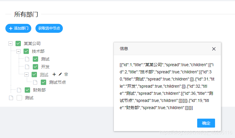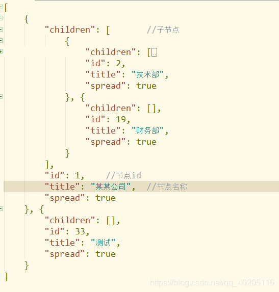 [ { "children": [ //子节点 { "children": [ { "children": [], "id": 30, "title": "测试", "spread": true }, { "children": [], "id": 31, "title": "开发", "spread": true }, { "children": [ { "children": [], "id": 36, "title": "测试节点", "spread": true } ], "id": 32, "title": "测试", "spread": true } ], "id": 2, "title": "技术部", "spread": true }, { "children": [], "id": 19, "title": "财务部", "spread": true } ], "id": 1, //节点id "title": "某某公司", //节点名称 "spread": true }, { "children": [], "id": 33, "title": "测试", "spread": true } ]