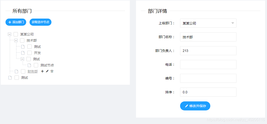 点击节点右面会显示对应部门的详情信息,可以修改。可以自定义按钮添加部门,也可以直接用自带的方法对部门进行新增,修改和删除。可以获取选中的节点,根据项目需求(有的需要选中保存)。