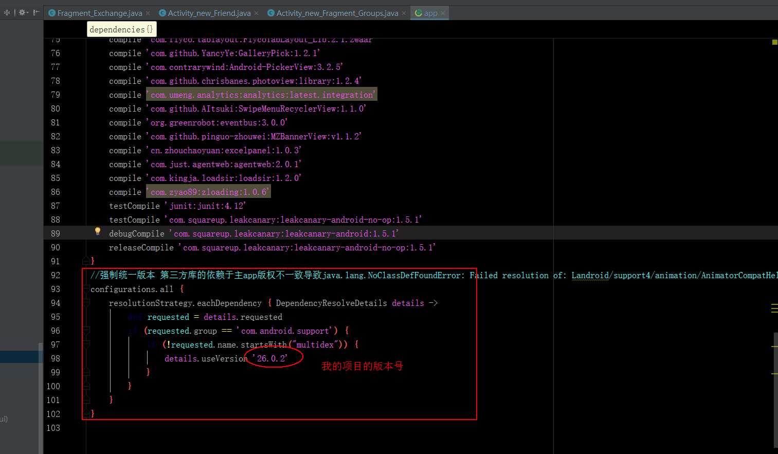 在开发过程中,有的时候引入了多个三方库.在调用的时候会出现版本对应不上的原因.就会出现如标题的异常.解决的办法就是在你的build.gradle里面加入如下代码块: