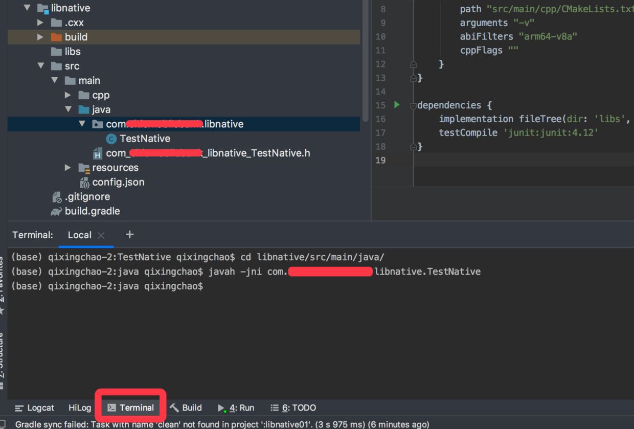 执行命令: 进入module目录: cd libnative/src/main/java/ 根据native方法生成头文件:javah -jni xxxx(包名).类名