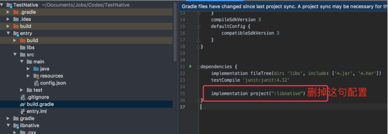 首先,我们先取消entry build.gradle中依赖libnative的配置(防止重复依赖,因为:har已包含了libnative的Java代码):