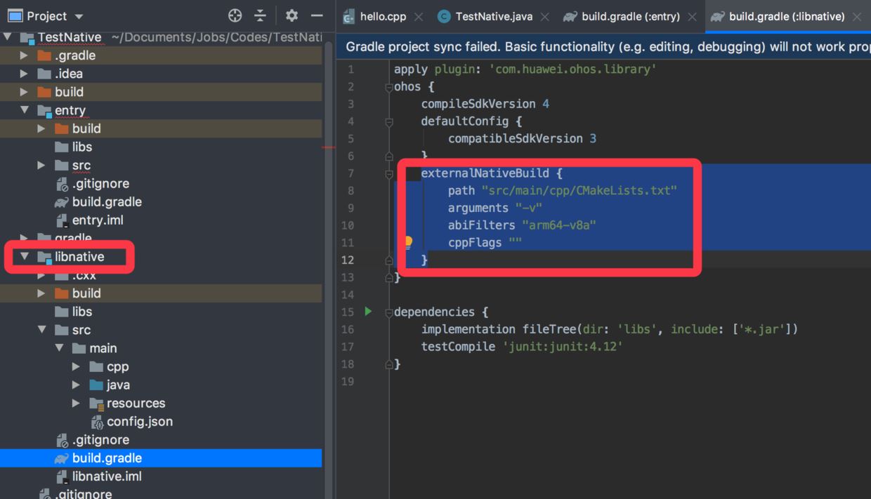 将entry下的build.gradle中 native 编译脚本拷贝至 libnative module中相同位置: