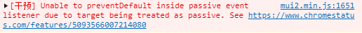 但是这个错误并不会影响运行 ,但是我有强迫症,查阅资料发现是touch事件不能侦听preventDefault的问题,就是触发触摸事件时候引起的问题,可以简单点给通配选择器加个样式touch-action:none,发现成功解决。