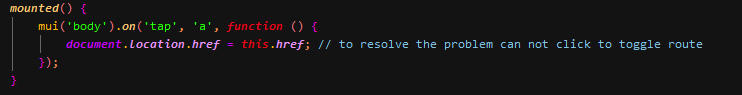 mounted() { mui('body').on('tap', 'a', function () { document.location.href = this.href; }); }