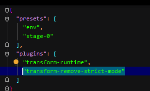 于是查阅资料发现webpack默认使用js的严格模式,但mui有些并不是严格模式,所以需要修改一下,安装babel包 并进入 .babelrc 文件 添加代码