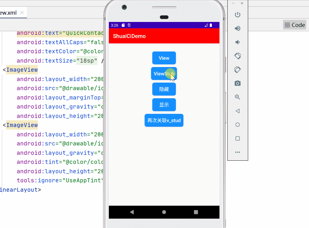一旦 ViewStub 变成 visible 或者被 inflate,它便不再可用(Id:viewStub没了),因为它在布局层级中的位置已经实例化出来的布局所替代,因为不能被访问,而应该使用 android:inflatedId 属性中的ID。如下: