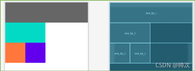 <?xml version="1.0" encoding="utf-8"?> <LinearLayout xmlns:android="http://schemas.android.com/apk/res/android" android:layout_width="match_parent" android:layout_height="match_parent" android:orientation="vertical"> <View android:id="@ id/view_top_1" android:layout_width="match_parent" android:layout_height="100dp" android:background="@color/color_666666"/> <View android:id="@ id/view_top_2" android:layout_width="200dp" android:layout_height="100dp" android:background="@color/teal_200"/> <LinearLayout android:layout_width="match_parent" android:layout_height="wrap_content" android:orientation="horizontal"> <View android:id="@ id/view_top_3" android:layout_width="100dp" android:layout_height="100dp" android:background="@color/color_FF773D"/> <View android:id="@ id/view_top_4" android:layout_width="100dp" android:layout_height="100dp" android:background="@color/purple_500"/> </LinearLayout> </LinearLayout>