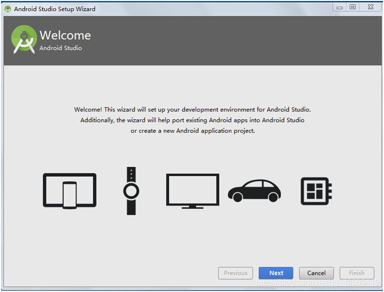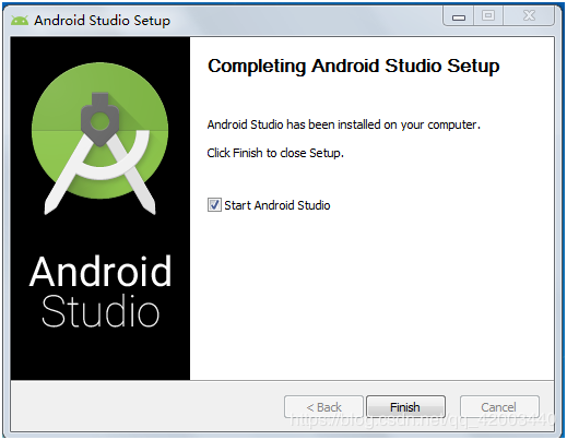 4、这里Android studio程序安装完毕,但是还需要继续对其进行配置;勾选Start Android Studio,然后点击finish启动AS,出现下图