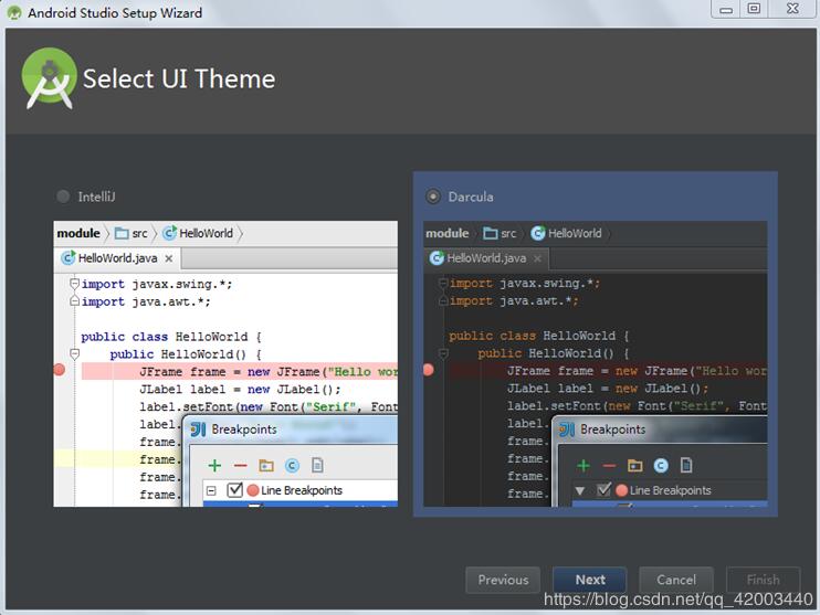 8、点击next进入UI界面主题选择界面,可以选择自己喜欢的风格,这里选择Darcula风格