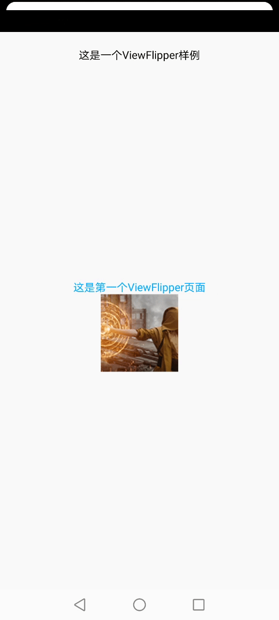 <LinearLayout xmlns:android="http://schemas.android.com/apk/res/android" android:layout_width="match_parent" android:layout_height="match_parent" android:orientation="vertical"> <TextView android:layout_width="match_parent" android:layout_height="wrap_content" android:textColor="@color/colorBlack" android:gravity="center" android:text="这是一个ViewFlipper样例" android:paddingTop="20dp"/> <ViewFlipper android:layout_width="match_parent" android:layout_height="match_parent" android:id="@ id/viewFlipper1"> <LinearLayout android:layout_width="match_parent" android:layout_height="match_parent" android:orientation="vertical" android:gravity="center"> <TextView android:layout_width="match_parent" android:layout_height="wrap_content" android:textColor="@color/colorBlue" android:gravity="center" android:text="这是第一个ViewFlipper页面"/> <ImageView android:layout_width="wrap_content" android:layout_height="wrap_content" android:src="@drawable/avasterdr"/> </LinearLayout> <LinearLayout android:layout_width="match_parent" android:layout_height="match_parent" android:orientation="vertical" android:gravity="center" > <TextView android:layout_width="match_parent" android:layout_height="wrap_content" android:textColor="@color/colorBlue" android:gravity="center" android:text="这是第二个ViewFlipper页面"/> <ImageView android:layout_width="wrap_content" android:layout_height="wrap_content" android:src="@drawable/avastertony"/> </LinearLayout> </ViewFlipper> </LinearLayout>
