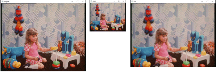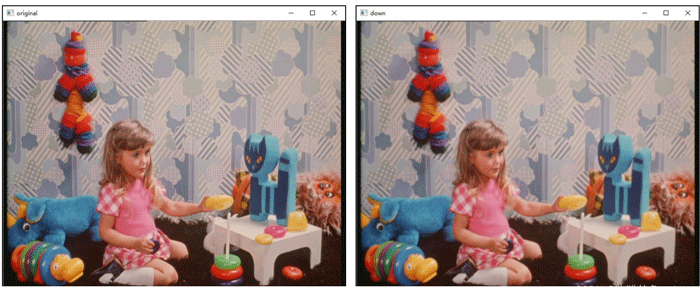 import cv2 o=cv2.imread("image\\girl.bmp") down=cv2.pyrDown(o) up=cv2.pyrUp(down) cv2.imshow("original",o) cv2.imshow("down",down) cv2.imshow("up",up) cv2.waitKey() cv2.destroyAllWindows()