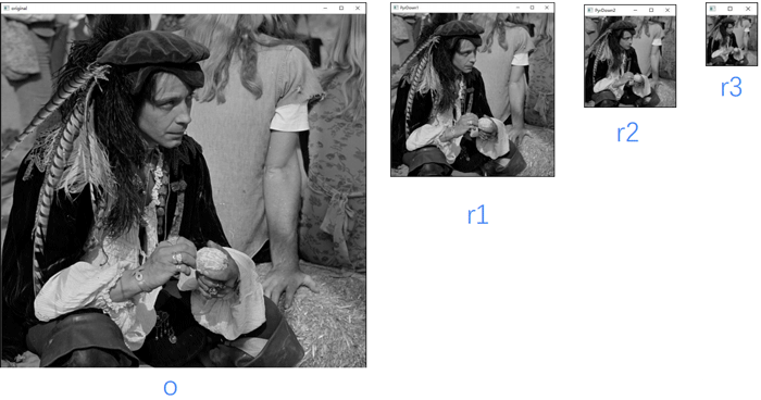 import cv2 import numpy as np o=cv2.imread("image\\man.bmp") r1=cv2.pyrDown(o) r2=cv2.pyrDown(r1) r3=cv2.pyrDown(r2) cv2.imshow("original",o) cv2.imshow("PyrDown1",r1) cv2.imshow("PyrDown2",r2) cv2.imshow("PyrDown3",r3) cv2.waitKey() cv2.destroyAllWindows()