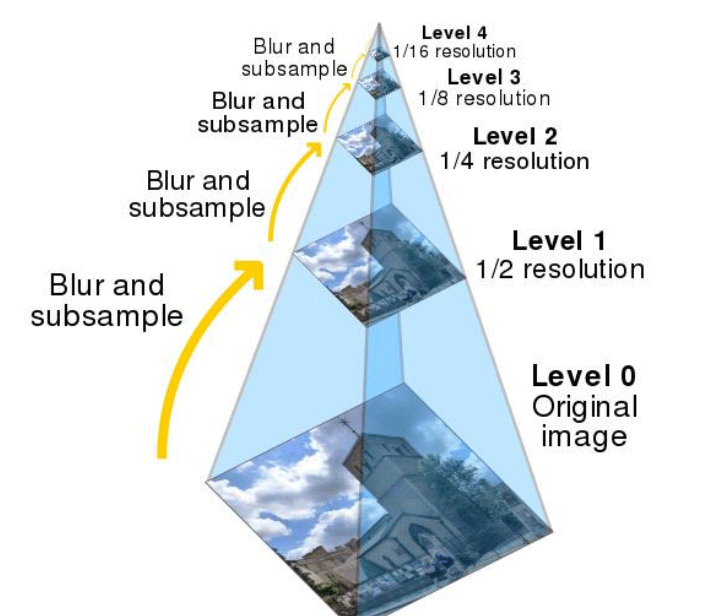 图像金字塔是图像多尺度表达的一种,是一种以多分辨率来解释图像的有效但概念简单的结构。一幅图像的金字塔是一系列以金字塔形状排列的分辨率逐步降低,且来源于同一张原始图的图像集合。其通过梯次向下采样获得,直到达到某个终止条件才停止采样。我们将一层一层的图像比喻成金字塔,层级越高,则图像越小,分辨率越低。