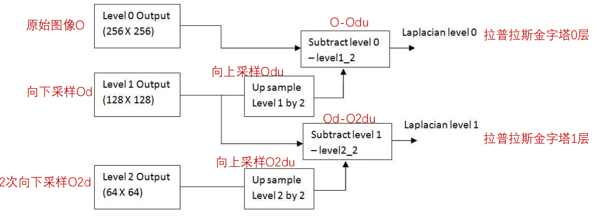 我们根据他这个式子可以知道,拉普拉斯金字塔就是使用原始图像减去图像向下取样然后向上取样的这样一个过程。