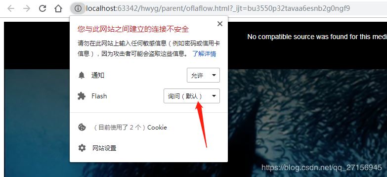 2:然后用google浏览器打开,就是页面上疯狂报“No compatible source was found for this media”这个错误,百度出来的都说是要把网页放到服务器上,不能直接打开,但是这个用idea直接打开的应该也属于放到服务器上了吧。不过应该不能直接双击html文件打开,我没试过。完了还是不行啊,后面发现浏览器中flash是“询问”状态,