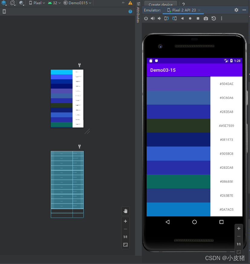 <?xml version="1.0" encoding="utf-8"?> <ScrollView xmlns:android="http://schemas.android.com/apk/res/android" android:layout_width="match_parent" android:layout_height="match_parent"> <LinearLayout android:layout_width="match_parent" android:layout_height="wrap_content" android:orientation="vertical"> <LinearLayout android:layout_width="match_parent" android:layout_height="wrap_content" android:orientation="horizontal"> <View android:layout_width="0dp" android:layout_height="60dp" android:layout_weight="2" android:background="#07C2FB" /> <TextView android:layout_width="0dp" android:layout_height="60dp" android:layout_weight="1" android:gravity="center" android:text="#07C2FB" /> </LinearLayout> <LinearLayout android:layout_width="match_parent" android:layout_height="wrap_content" android:orientation="horizontal"> <View android:layout_width="0dp" android:layout_height="60dp" android:layout_weight="2" android:background="#C60426FD" /> <TextView android:layout_width="0dp" android:layout_height="60dp" android:layout_weight="1" android:gravity="center" android:text="#C60426FD" /> </LinearLayout> <LinearLayout android:layout_width="match_parent" android:layout_height="wrap_content" android:orientation="horizontal"> <View android:layout_width="0dp" android:layout_height="60dp" android:layout_weight="2" android:background="#032898" /> <TextView android:layout_width="0dp" android:layout_height="60dp" android:layout_weight="1" android:gravity="center" android:text="#032898" /> </LinearLayout> <LinearLayout android:layout_width="match_parent" android:layout_height="wrap_content" android:orientation="horizontal"> <View android:layout_width="0dp" android:layout_height="60dp" android:layout_weight="2" android:background="#021173" /> <TextView android:layout_width="0dp" android:layout_height="60dp" android:layout_weight="1" android:gravity="center" android:text="#021173" /> </LinearLayout> <LinearLayout android:layout_width="match_parent" android:layout_height="wrap_content" android:orientation="horizontal"> <View android:layout_width="0dp" android:layout_height="60dp" android:layout_weight="2" android:background="#504DAE" /> <TextView android:layout_width="0dp" android:layout_height="60dp" android:layout_weight="1" android:gravity="center" android:text="#504DAE" /> </LinearLayout> <LinearLayout android:layout_width="match_parent" android:layout_height="wrap_content" android:orientation="horizontal"> <View android:layout_width="0dp" android:layout_height="60dp" android:layout_weight="2" android:background="#3C60A6" /> <TextView android:layout_width="0dp" android:layout_height="60dp" android:layout_weight="1" android:gravity="center" android:text="#3C60A6" /> </LinearLayout> <LinearLayout android:layout_width="match_parent" android:layout_height="wrap_content" android:orientation="horizontal"> <View android:layout_width="0dp" android:layout_height="60dp" android:layout_weight="2" android:background="#282EA8" /> <TextView android:layout_width="0dp" android:layout_height="60dp" android:layout_weight="1" android:gravity="center" android:text="#282EA8" /> </LinearLayout> <LinearLayout android:layout_width="match_parent" android:layout_height="wrap_content" android:orientation="horizontal"> <View android:layout_width="0dp" android:layout_height="60dp" android:layout_weight="2" android:background="#273523" /> <TextView android:layout_width="0dp" android:layout_height="60dp" android:layout_weight="1" android:gravity="center" android:text="##5E7559" /> </LinearLayout> <LinearLayout android:layout_width="match_parent" android:layout_height="wrap_content" android:orientation="horizontal"> <View android:layout_width="0dp" android:layout_height="60dp" android:layout_weight="2" android:background="#0E1E73" /> <TextView android:layout_width="0dp" android:layout_height="60dp" android:layout_weight="1" android:gravity="center" android:text="#0E1E73" /> </LinearLayout> <LinearLayout android:layout_width="match_parent" android:layout_height="wrap_content" android:orientation="horizontal"> <View android:layout_width="0dp" android:layout_height="60dp" android:layout_weight="2" android:background="#305BC8" /> <TextView android:layout_width="0dp" android:layout_height="60dp" android:layout_weight="1" android:gravity="center" android:text="#305BC8" /> </LinearLayout> <LinearLayout android:layout_width="match_parent" android:layout_height="wrap_content" android:orientation="horizontal"> <View android:layout_width="0dp" android:layout_height="60dp" android:layout_weight="2" android:background="#282EA8" /> <TextView android:layout_width="0dp" android:layout_height="60dp" android:layout_weight="1" android:gravity="center" android:text="#282EA8" /> </LinearLayout> <LinearLayout android:layout_width="match_parent" android:layout_height="wrap_content" android:orientation="horizontal"> <View android:layout_width="0dp" android:layout_height="60dp" android:layout_weight="2" android:background="#0B685E" /> <TextView android:layout_width="0dp" android:layout_height="60dp" android:layout_weight="1" android:gravity="center" android:text="#0B685E" /> </LinearLayout> <LinearLayout android:layout_width="match_parent" android:layout_height="wrap_content" android:orientation="horizontal"> <View android:layout_width="0dp" android:layout_height="60dp" android:layout_weight="2" android:background="#263B7E" /> <TextView android:layout_width="0dp" android:layout_height="60dp" android:layout_weight="1" android:gravity="center" android:text="#263B7E" /> </LinearLayout> <LinearLayout android:layout_width="match_parent" android:layout_height="wrap_content" android:orientation="horizontal"> <View android:layout_width="0dp" android:layout_height="60dp" android:layout_weight="2" android:background="#0A7AC5" /> <TextView android:layout_width="0dp" android:layout_height="60dp" android:layout_weight="1" android:gravity="center" android:text="#0A7AC5" /> </LinearLayout> </LinearLayout> </ScrollView>