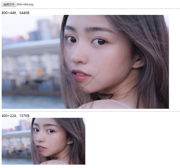 <!DOCTYPE html> <html lang="en"> <head> <meta charset="UTF-8"> <meta name="viewport" content="width=device-width, initial-scale=1.0"> <meta http-equiv="X-UA-Compatible" content="ie=edge"> <title>Document</title> </head> <body> <input type="file" onchange="loadImg(this)"> <hr> <div>800×449,544KB</div> <img src="" alt=""> <hr> <div>400×224,157KB</div> <canvas></canvas> <script> // 上传图片 function loadImg(me) { let img = document.querySelector('img'); let cvs = document.querySelector('canvas'); let file = me.files[0]; // 获取到文件对象 // 上传的图片大于 500KB 时才压缩 if (file && (file.size / 1024 > 500)) { let reader = new FileReader(); reader.readAsDataURL(file); // 转成 base64 编码 reader.onload = function (e) { let naturalBase64 = e.target.result; // 获取 base64 编码,这是原图的 img.src = naturalBase64; img.onload = function () { let ratio = img.naturalWidth / img.naturalHeight; // 获取原图比例,为了等比压缩 cvs.width = 400; cvs.height = cvs.width / ratio; let ctx = cvs.getContext('2d'); ctx.drawImage(img, 0, 0, cvs.width, cvs.height); // 画在 canvas 上 // 压缩后新图的 base64 let zipBase64 = cvs.toDataURL(); } } } } </script> </body> </html>