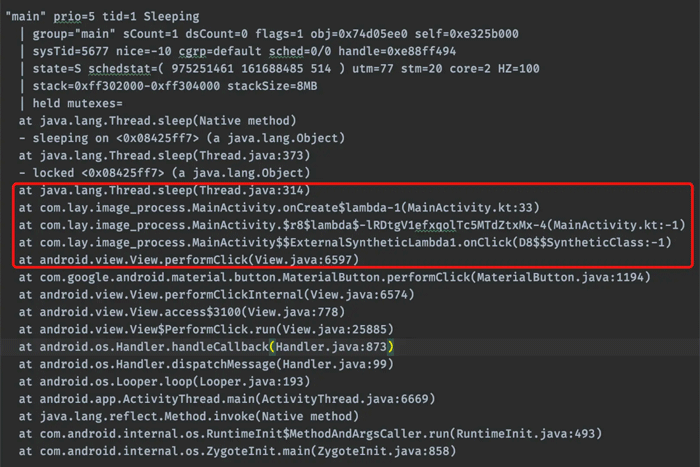 打开trace日志,通过这一部分就能猜到具体原因了,就是因为在主线程中,响应点击事件时,线程进入休眠阻塞