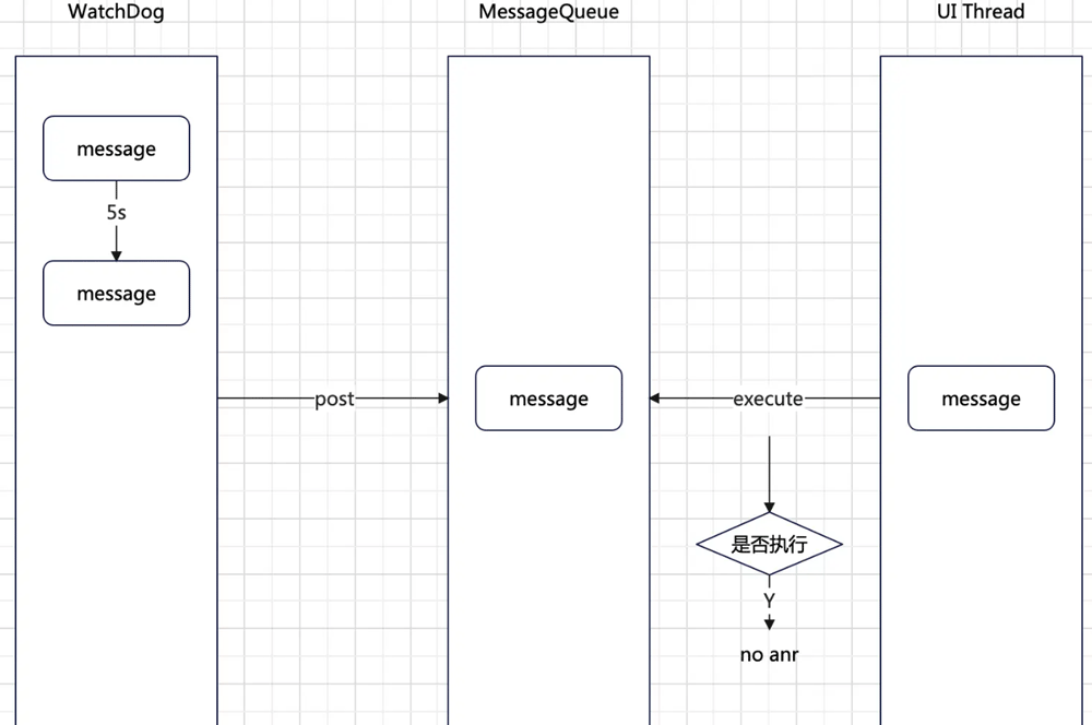 从上面这张图可以理解WatchDog的原理:首先WatchDog是一个线程,每隔5s发送一个Message消息到主线程的MessageQueue中,主线程Looper从消息队列中取出Message,如果没有阻塞,那么在5s内会执行这个Message任务,就没有ANR;如果超过5s没有执行,那么就有可能出现ANR。