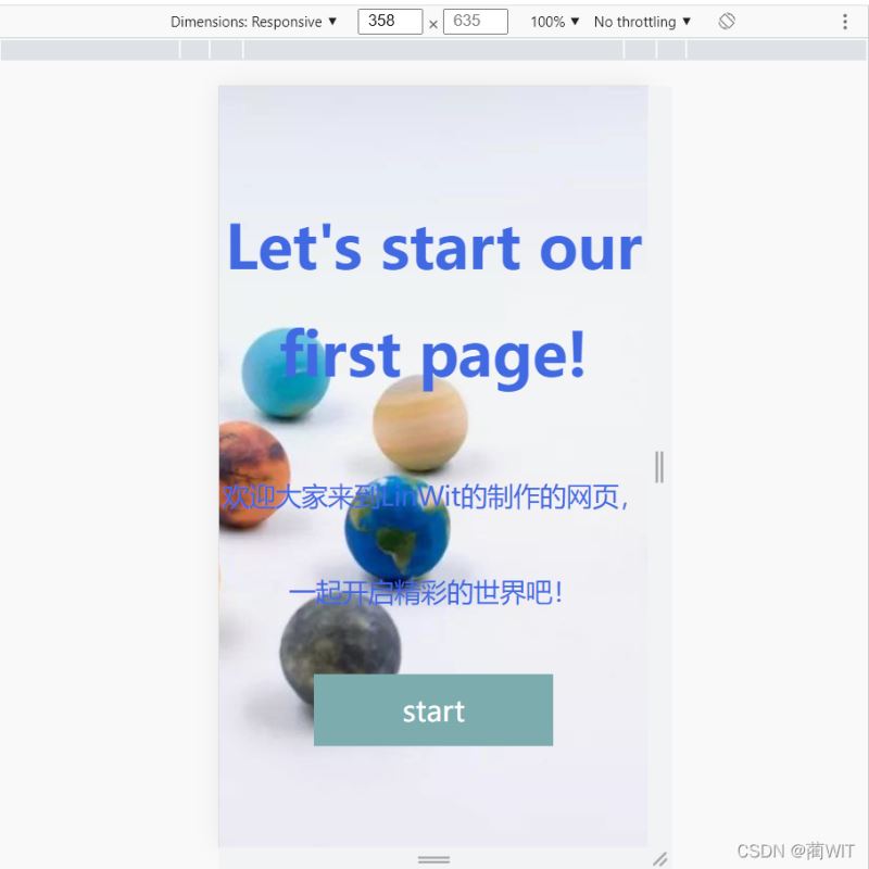 <!DOCTYPE html> <html lang="en"> <head> <meta name="viewport" content="width=device-width,initial-scale=1 .0 user-scale"/> <meta charset="utf-8" /> <title>Document</title> <style> html,body{ height:100%; margin:0; padding:0; } body{ background: red url(img/index.jpg) center center; background-size: cover; position: relative;/* 相对位置 */ } .container{ position: absolute;/* 绝对位置 */ top: 50%; text-align: center; width: 100%; transform: translateY(-50%);/* 将div元素上移至自身高度的50% */ } h1{ line-height: 90px; color: royalblue; font-size: 50px; } p{ line-height: 80px; color: royalblue; font-size: 22px; } .btn{ width: 200px; height: 60px; background-color: #7cacae; color: #fff; font-size: 24px; line-height: 60px; margin: 30px auto;/* 设置其上下边距:30px 左右边距:自动 */ border-radius: 10px;/* 给按钮增加圆角样式 */ transition: 1s; } .btn:hover{ background-color: royalblue; width: 300px; height: 100px; line-height: 100px; font-size: 36px; margin: 100px auto; } </style> </head> <body> <div class="container"> <h1>Let's start our first page!</h1> <p>欢迎大家来到LinWit的制作的网页, 一起开启精彩的世界吧! </p> <div class="btn" id="start">start</div> </div> </body> </html>