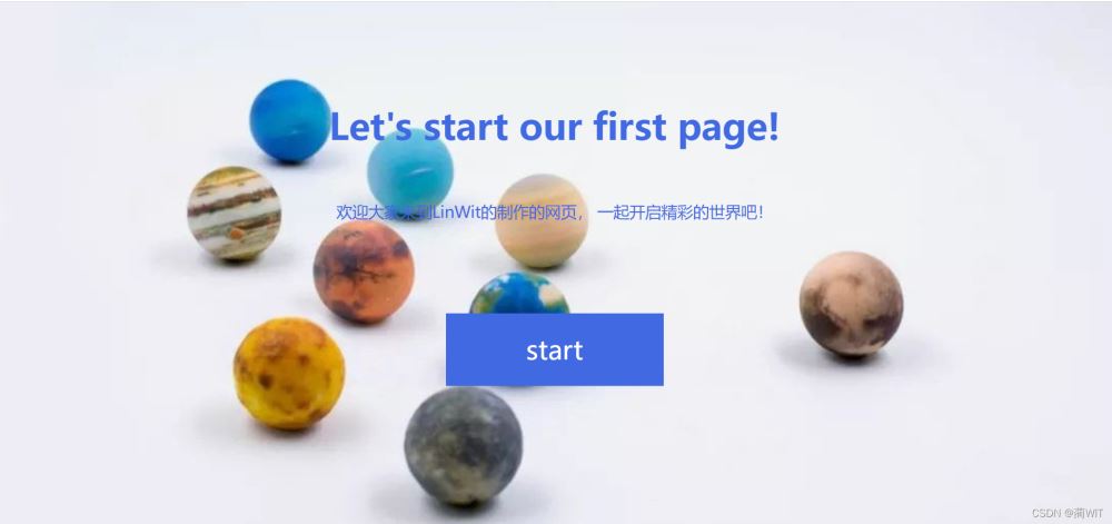 <body> <div class="container"> <h1>Let's start our first page!</h1> <p>欢迎大家来到LinWit的制作的网页, 一起开启精彩的世界吧! </p> <div class="btn" id="start">start</div> </div> </body>