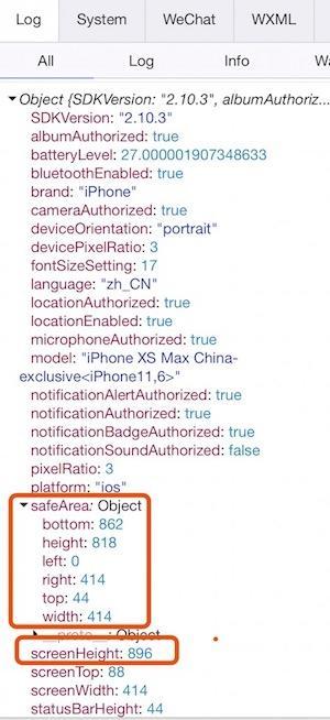 已知市面上已有的带安全区域的苹果设备包括iPhone X、iPhone XR、iPhone XS Max、iPhone 11、iPhone 11 Pro、iPhone 11 Pro Max,所以可以直接从getSystemInfoSync()方法中拿到model属性进行判断。iPhone系列微信还未适配手机的model返回值为unknown(iphone),也可以提前做适配。
