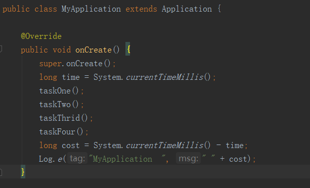 这样我们运行的时候,就会直接在logcat中打印出application中的onCreate方法中所有调用方法的耗时情况了