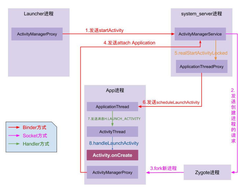 从图中可以看出,APP启动的过程是:ActivityManagerProxy 通过IPC来调用AMS(ActivityManagerService),AMS通过IPC启动一个APP进程,ApplicationThread通过反射来创建Application并且绑定,最后通过ActivityThread来控制activity的生命周期,在相关页面的生命周期中通过ViewRootImpl来对view的实现。从而完成应用的启动。