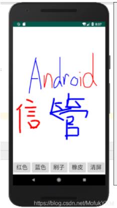 <?xml version="1.0" encoding="utf-8"?> <LinearLayout xmlns:android="http://schemas.android.com/apk/res/android" android:layout_width="fill_parent" android:layout_height="fill_parent" android:orientation="vertical" > <com.xdw.exercise.HandWrite android:id="@ id/handwriteview" android:layout_width="fill_parent" android:layout_height="600dp" /> <LinearLayout android:layout_width="match_parent" android:layout_height="wrap_content" android:orientation="horizontal"> <Button android:id="@ id/red" android:layout_width="wrap_content" android:layout_height="wrap_content" android:textSize="25dp" android:layout_weight="1" android:text="红色" /> <Button android:id="@ id/blue" android:layout_width="wrap_content" android:layout_height="wrap_content" android:textSize="25dp" android:layout_weight="1" android:text="蓝色" /> <Button android:id="@ id/brush" android:layout_width="wrap_content" android:layout_height="wrap_content" android:textSize="25dp" android:layout_weight="1" android:text="刷子" /> <Button android:id="@ id/eraser" android:layout_width="wrap_content" android:layout_height="wrap_content" android:textSize="25dp" android:layout_weight="1" android:text="橡皮" /> <Button android:id="@ id/clear" android:layout_width="wrap_content" android:layout_height="wrap_content" android:textSize="25dp" android:layout_weight="1" android:text="清屏" /> </LinearLayout> </LinearLayout>
