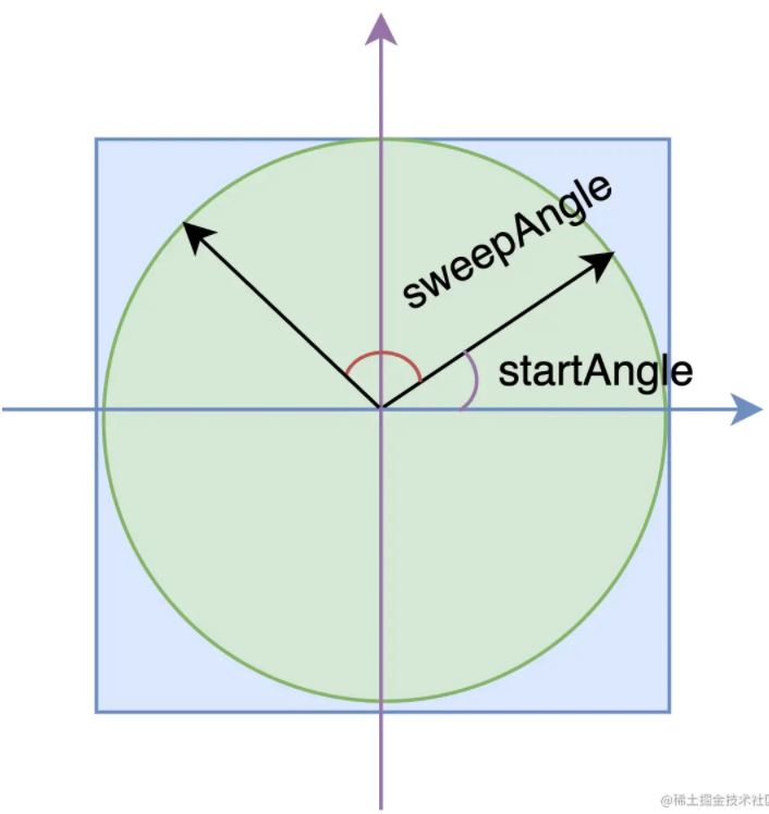 (弧线覆盖的角度范围)就能够确定弧线的起点和终点,从而得到一段弧线。注意的是,数学里我们是逆时针角度为正,但是在 Flutter 默认是顺时针为正,因此如果你要从逆时针方向开始角度就要设置为负数。