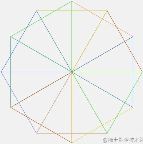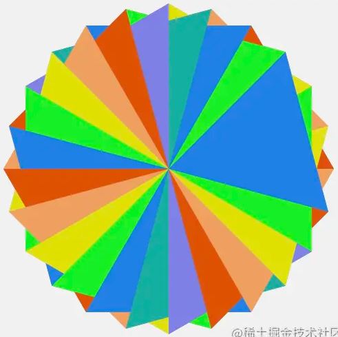 形状越多,会越接近圆形,你会充分发现对称之美。下面是我们用24个三角形,填充不同颜色后的效果。有点像一把彩虹伞的伞面了,感觉是不是很美?