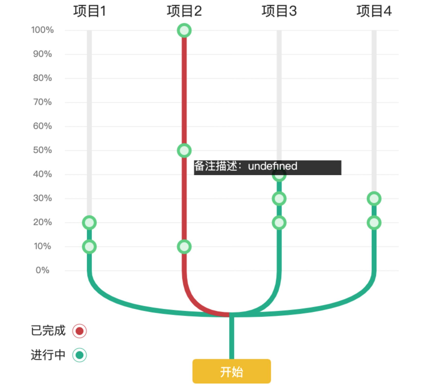 const canvas_options={ canvasWidth: 750, canvasHeight: 800, chartZone: [70,70,750,570], //坐标绘制区域 yAxisLabel: ['0%','10%','20%','30%','40%','50%','60%','70%','80%','90%','100%'],//y轴坐标text yAxisLabelWidth: 70,//y轴最大宽度 yAxisLabelMax: 100,//y轴最大值 middleLine: 410, //中间线 pillarWidth: 10,//柱子宽度 distanceBetween: 50,//柱状图绘制区域距离两边间隙 pillar: [120,70,700,750],//柱状图绘制区域 mainTrunkHeight: 90,//底部开始主干高度 dialogWidth: 300,//弹窗宽度 dialogLineHeight: 30,//弹窗高度 dialogDrawLineMax: 4, } const nodeClick = []; var chooseNode = null; const datalist={ showDataInfo: { city:[ { name: '项目1', status: 1, //状态:0已完成 1进行中 node: [ { value: 10, date: '2020-03-12 15:50:02', content: '用于组织信息和操作,通常也作为详细信息的入口。' }, { value: 20, date: '2020-03-12 15:50:02', content: '用于组织信息和操作,通常也作为详细信息的入口。' }, ] }, { name: '项目2', status: 0, //状态:0已完成 1进行中 node: [ { value: 10, date: '2020-03-12 15:50:02', content: '用于组织信息和操作,通常也作为详细信息的入口。' }, { value: 50, date: '2020-03-12 15:50:02', content: '用于组织信息和操作,通常也作为详细信息的入口。' }, { value: 100, date: '2020-03-12 15:50:02', content: '用于组织信息和操作,通常也作为详细信息的入口。' }, ] }, { name: '项目3', status: 1, //状态:0已完成 1进行中 node: [ { value: 20, date: '2020-03-12 15:50:02', content: '用于组织信息和操作,通常也作为详细信息的入口。' }, { value: 30, date: '2020-03-12 15:50:02', content: '用于组织信息和操作,通常也作为详细信息的入口。' }, { value: 40, date: '2020-03-12 15:50:02', content: '用于组织信息和操作,通常也作为详细信息的入口。' }, ] }, { name: '项目4', status: 1, //状态:0已完成 1进行中 node: [ { value: 20, date: '2020-03-12 15:50:02', content: '用于组织信息和操作,通常也作为详细信息的入口。' }, { value: 30, date: '2020-03-12 15:50:02', content: '用于组织信息和操作,通常也作为详细信息的入口。' }, ] }, ] } } const canvas = document.getElementById("canvas"); const ctx = canvas.getContext('2d'); ctx.save(); drawYLabel(canvas_options,ctx); //绘制y轴坐标 drawStartButton(ctx,canvas_options); drawData(ctx,datalist.showDataInfo,canvas_options); canvas.addEventListener("click",event=>{ //清除之前的弹窗 if(chooseNode!=null){ ctx.clearRect(0, 0, canvas.width, canvas.height); ctx.save(); drawYLabel(canvas_options,ctx); //绘制y轴坐标 drawStartButton(ctx,canvas_options); drawData(ctx,datalist.showDataInfo,canvas_options); chooseNode = null } //判断点击节点 let rect = canvas.getBoundingClientRect(); let zoom = rect.width/canvas_options.canvasWidth; let x = (event.clientX/zoom - rect.left/zoom).toFixed(2); let y = (event.clientY/zoom - rect.top/zoom).toFixed(2); for(var t=0;t<nodeClick.length;t ){ ctx.beginPath(); ctx.arc(nodeClick[t].x,nodeClick[t].y,15,0,Math.PI*2,true); if(ctx.isPointInPath(x, y)){ textPrewrap(ctx,`备注描述:${nodeClick[t].date}`,nodeClick[t].x 20,nodeClick[t].y 20,canvas_options.dialogWidth-40); ctx.restore(); chooseNode=t break; }else{ chooseNode=null } } }); //content:需要绘制的文本内容; drawX:绘制文本的x坐标; drawY:绘制文本的y坐标; //lineMaxWidth:每行文本的最大宽度 function textPrewrap(ctx,content,drawX, drawY, lineMaxWidth){ var drawTxt=''; //当前绘制的内容 var drawLine = 1;//第几行开始绘制 var drawIndex=0;//当前绘制内容的索引 //判断内容是够可以一行绘制完毕 if(ctx.measureText(content).width<=lineMaxWidth){ drawDialog(ctx,canvas_options.dialogWidth,canvas_options.dialogLineHeight,drawX,drawY); ctx.fillText(content.substring(drawIndex,i),drawX.drawY); }else{ for(var i=0;i<content.length;i ){ drawTxt = content[i]; if(ctx.measureText(drawTxt).width>=lineMaxWidth){ drawDialog(ctx,canvas_options.dialogWidth,canvas_options.dialogLineHeight,drawX,drawY); ctx.fillText(content.substring(drawIndex,i 1),drawX,drawY); drawIndex = i 1; drawLine =1; //drawY =lineHeight; drawTxt=''; }else{ //内容绘制完毕,但是剩下的内容宽度不到lineMaxWidth if(i===content.length-1){ drawDialog(ctx,canvas_options.dialogWidth,canvas_options.dialogLineHeight,drawX,drawY); ctx.fillText(content.substring(drawIndex,i 1),drawX,drawY) } } } } } function drawDialog(ctx,width,height,x,y){ ctx.beginPath(); ctx.fillStyle="rgba(0,0,0,0.8)"; ctx.fillRect(x,y,width,height); ctx.font="22px ''"; ctx.fillStyle="#fff"; ctx.textAlign = 'left'; ctx.textBaseline="top"; } //绘制y轴坐标 function drawYLabel(options,ctx){ let labels = options.yAxisLabel; let yLength = (options.chartZone[3]-options.chartZone[1])*0.98; let gap = yLength/(labels.length-1); labels.forEach((item,index)=>{ //绘制圆角背景 //this.radiusButton(ctx,0,options.chartZone[3]-index*gap-13,50,24,8,"#313947"); //绘制坐标文字 ctx.beginPath(); ctx.fillStyle="#878787"; ctx.font="18px ''"; ctx.textAlign="center"; ctx.fillText(item,25,options.chartZone[3]-index*gap 5); //绘制辅助线 ctx.beginPath(); ctx.strokeStyle="#eaeaea"; ctx.strokeWidth=2; ctx.moveTo(options.chartZone[0],options.chartZone[3]-index*gap); ctx.lineTo(options.chartZone[2],options.chartZone[3]-index*gap); ctx.stroke(); }) } //绘制开始按钮 function drawStartButton(ctx,options){ //绘制按钮图形 this.radiusButton(ctx,options.middleLine-(160/2),options.canvasHeight-50,160,50,8,'#F4C63D'); ctx.fillStyle="#fff"; ctx.font="24px ''"; ctx.textAlign="center"; ctx.fillText('开始',options.middleLine,options.canvasHeight-15); //绘制状态 ctx.beginPath(); ctx.fillStyle="#333"; ctx.font="24px ''"; ctx.textAlign = "left"; ctx.fillText("已完成",0,options.canvasHeight-100); ctx.fillText("进行中",0,options.canvasHeight-50); //绘制红色按钮 ctx.beginPath(); ctx.fillStyle="#d35453"; ctx.arc(options.cha