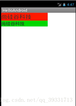 <?xml version="1.0" encoding="utf-8"?> <LinearLayout xmlns:android="http://schemas.android.com/apk/res/android" android:layout_width="match_parent" android:layout_height="match_parent" android:orientation="vertical" > <TextView android:layout_width="200dp" android:layout_height="wrap_content" android:text="尚硅谷科技" android:background="#ff0000" android:textSize="20sp"/> <TextView android:id="@ id/textView2" android:layout_width="200px" android:layout_height="wrap_content" android:text="尚硅谷科技" android:background="#00ff00" android:textSize="20dp"/> </LinearLayout>