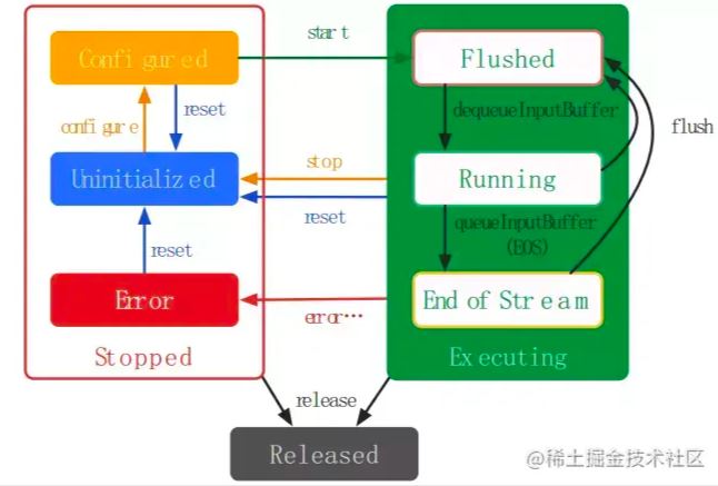 - getInputBuffers: 获取需要编码数据的输入队列 返回ByteBuffer数组