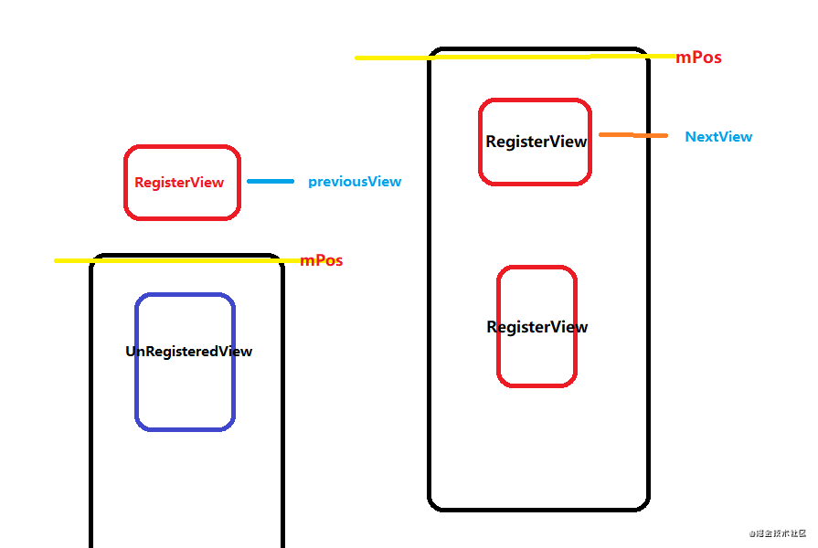 - previousView:当前滚动位置的前一个View,或者说是Y坐标小于mPos的最近的View。