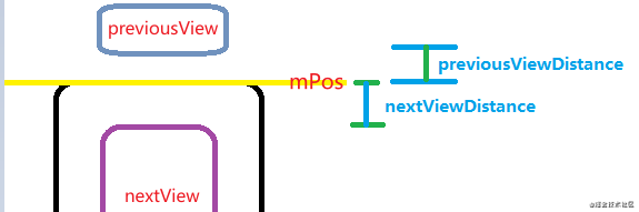 计算previousView与mPos的距离,nextView与mPos的距离. 这个距离其实很好计算。直接拿两个坐标相减即可得到。