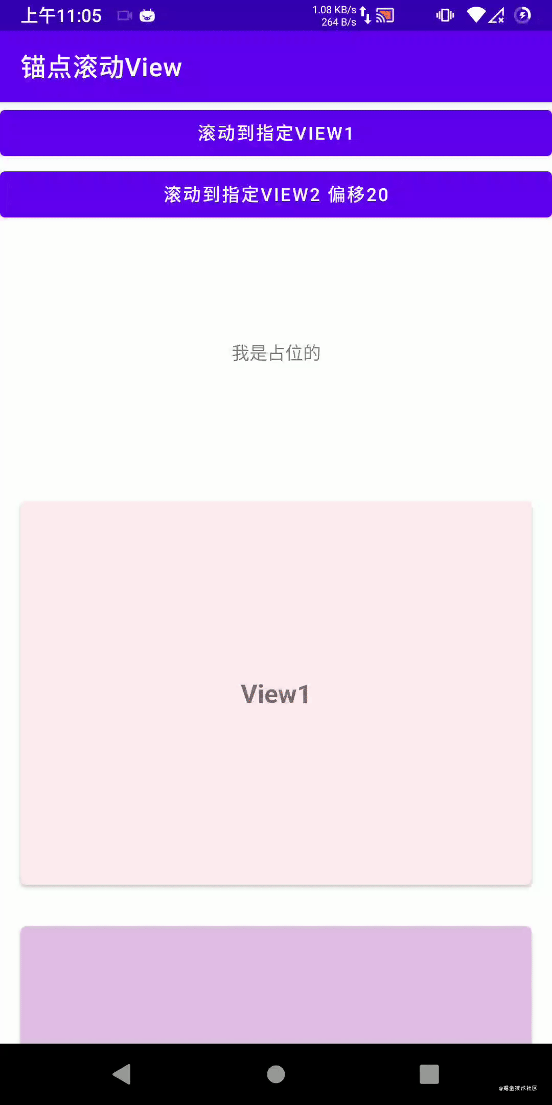 //滚动到第一个View fun scrollView1(view: View) { viewBinding.scrollView.scrollToView(R.id.demo_view1) } //滚动到第二个View 上方偏移50像素 fun scrollView2Offset(view: View) { viewBinding.scrollView.scrollToView(R.id.demo_view2,50) }