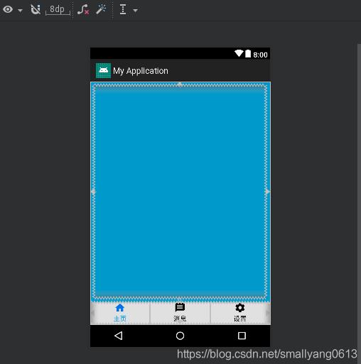 <?xml version="1.0" encoding="utf-8"?> <android.support.constraint.ConstraintLayout xmlns:android="http://schemas.android.com/apk/res/android" xmlns:app="http://schemas.android.com/apk/res-auto" xmlns:tools="http://schemas.android.com/tools" android:layout_width="match_parent" android:layout_height="match_parent" android:background="@android:color/holo_blue_dark" tools:context=".HomeActivity"> <LinearLayout android:id="@ id/llHomePage" android:layout_width="0dp" android:layout_height="0dp" android:layout_marginStart="8dp" android:layout_marginLeft="8dp" android:layout_marginTop="8dp" android:layout_marginEnd="8dp" android:layout_marginRight="8dp" android:layout_marginBottom="8dp" android:orientation="vertical" app:layout_constraintBottom_toTopOf="@ id/llHomeNav" app:layout_constraintEnd_toEndOf="parent" app:layout_constraintStart_toStartOf="parent" app:layout_constraintTop_toTopOf="parent"> <!-- 该 LinearLayout 为主体页面布局的容器,你也可以根据需要换成其他形式的 Layout 以上代码将页面布局容器和底部的导航栏进行了约束 即该容器的底端和导航栏的顶端彼此约束 确保该容器的占用空间不会覆盖导航栏 页面的主体布局请在该容器内部(即此处)创建 --> </LinearLayout> <!-- 以下为导航栏的布局 --> <LinearLayout android:id="@ id/llHomeNav" style="?android:attr/buttonBarStyle" android:layout_width="0dp" android:layout_height="wrap_content" android:background="@color/navBack" android:orientation="horizontal" app:layout_constraintBottom_toBottomOf="parent" app:layout_constraintEnd_toEndOf="parent" app:layout_constraintStart_toStartOf="parent" app:layout_constraintTop_toBottomOf="@ id/llHomePage"> <!-- 【主页】活动中,【主页】按钮设为已激活样式,注意 drawableTop 和 textColor 属性的值 --> <Button android:id="@ id/btnNavHome" style="?android:attr/buttonBarButtonStyle" android:layout_width="0dp" android:layout_height="wrap_content" android:layout_weight="1" android:drawableTop="@drawable/home1" android:onClick="onNavButtonsTapped" android:text="@string/btnNavHome" android:textAppearance="?android:attr/textAppearanceSmall" android:textColor="@color/navActivated" /> <!-- 其他按钮设为未激活样式,注意 drawableTop 和 textColor 属性的值 --> <Button android:id="@ id/btnNavMessage" style="?android:attr/buttonBarButtonStyle" android:layout_width="0dp" android:layout_height="wrap_content" android:layout_weight="1" android:drawableTop="@drawable/message0" android:onClick="onNavButtonsTapped" android:text="@string/btnNavMessage" android:textAppearance="?android:attr/textAppearanceSmall" android:textColor="@color/navNormal" /> <Button android:id="@ id/btnNavSettings" style="?android:attr/buttonBarButtonStyle" android:layout_width="0dp" android:layout_height="wrap_content" android:layout_weight="1" android:drawableTop="@drawable/settings0" android:onClick="onNavButtonsTapped" android:text="@string/btnNavSettings" android:textAppearance="?android:attr/textAppearanceSmall" android:textColor="@color/navNormal" /> </LinearLayout> </android.support.constraint.ConstraintLayout>