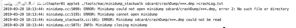执行命令./tools/mac/minidump_stackwalk sdcard/crashDump/***.dmp >crashLog.txt 后出错,先把.dmp文件拷贝到电脑上再执行该命令