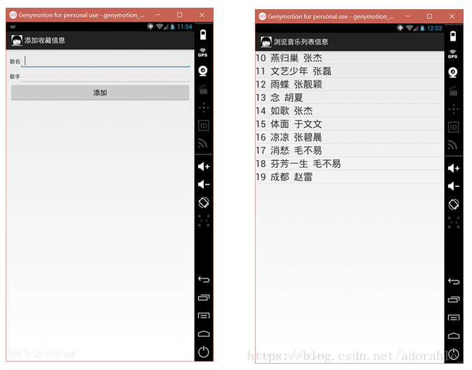 (2)创建添加音乐的AddActivity,添加界面提供两个文本框和一个按钮,用于输入音乐名和歌手名,当单击“添加”按钮时,将数据插入到表中,具体代码如下: