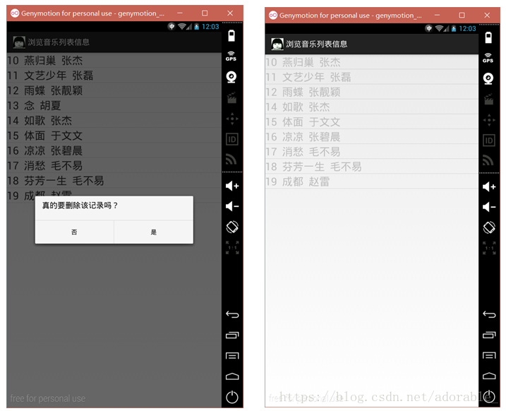 在音乐列表中单击一条记录,弹出警告对话框删除一条记录: