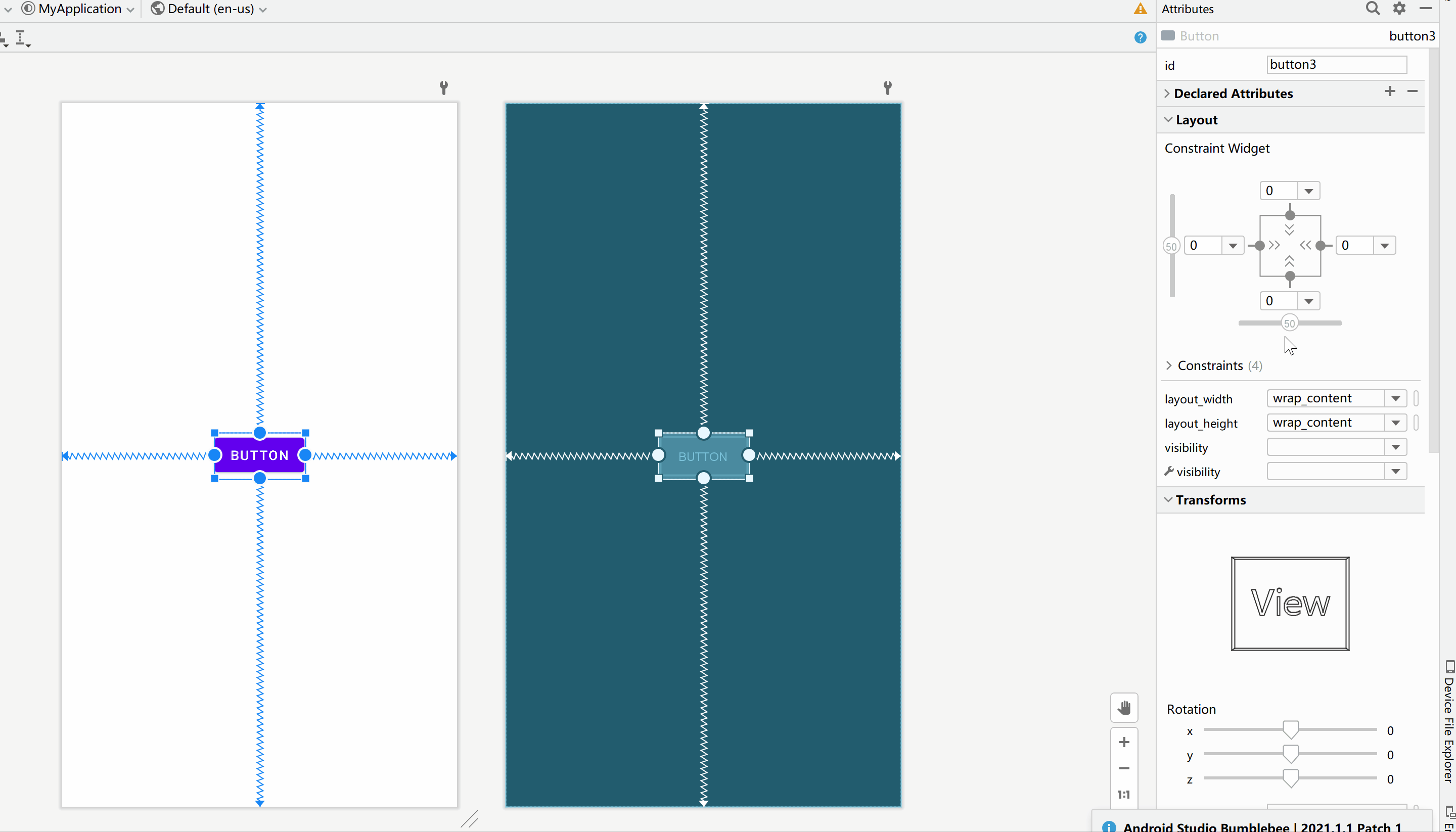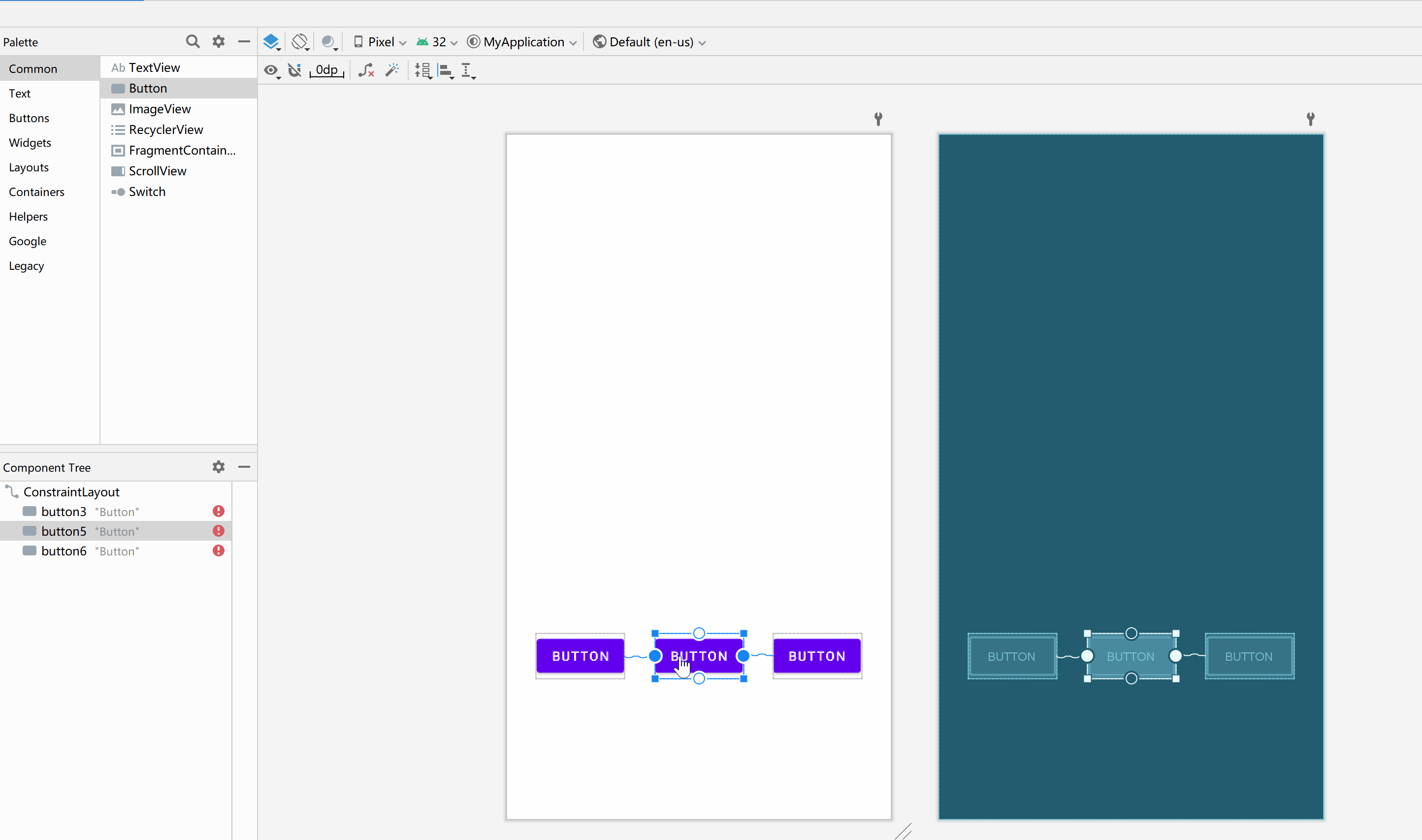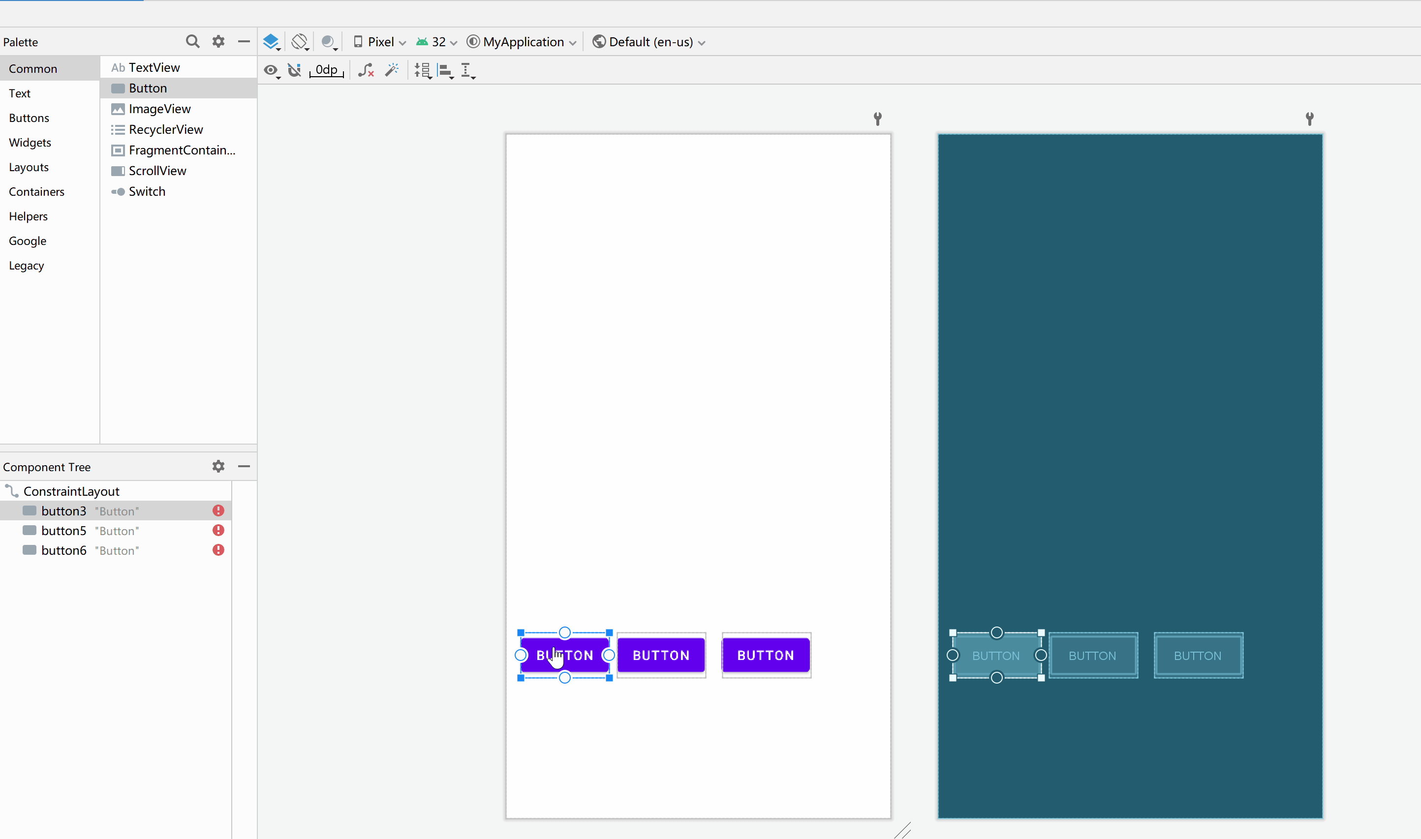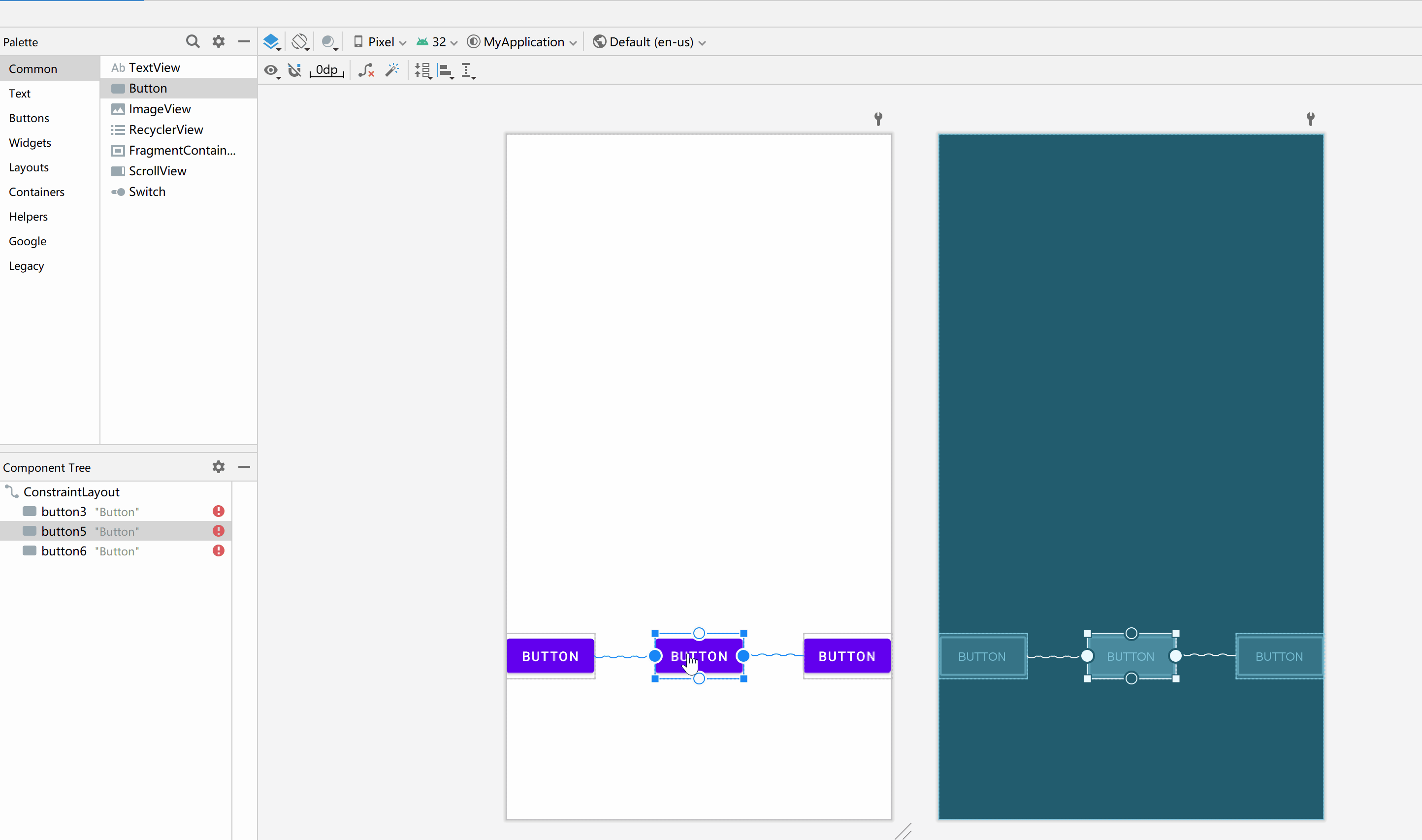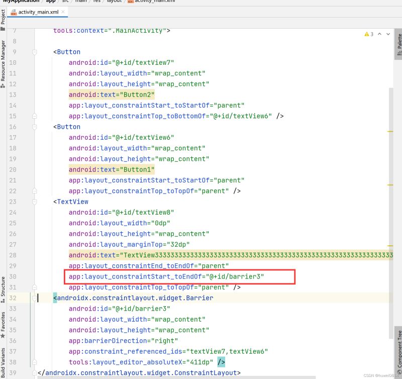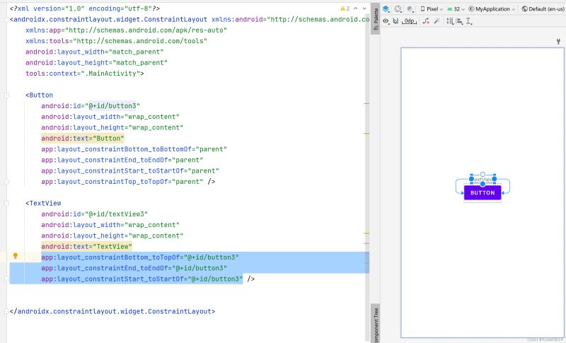 - app:layout_constraintEnd_toEndOf="@ id/button3" 右边添加约束到其他控件右边