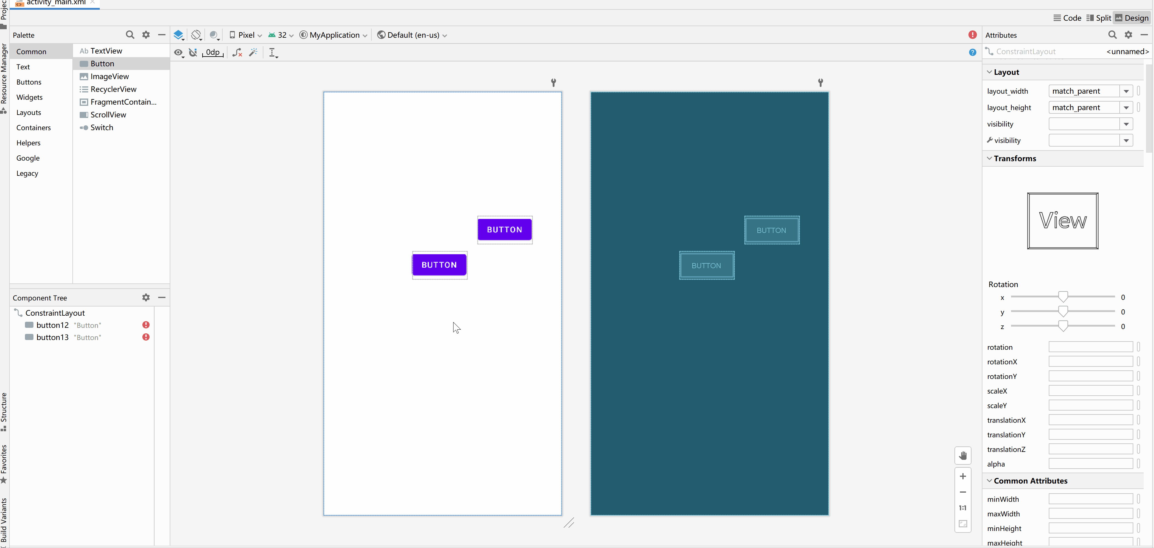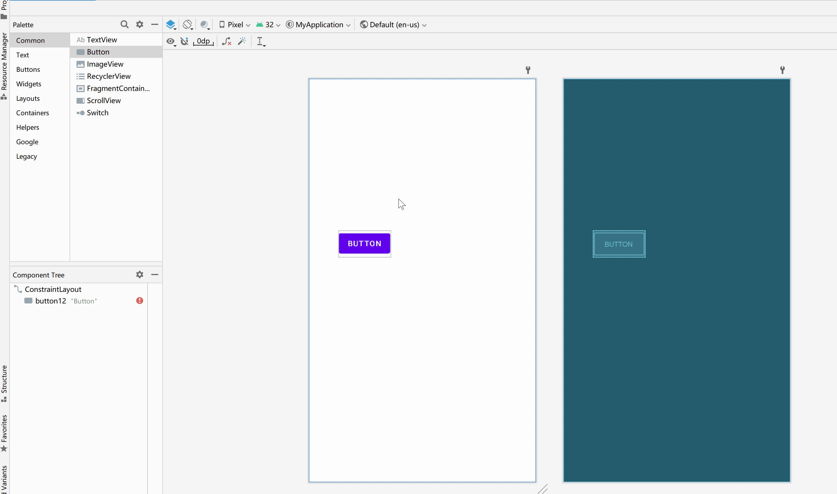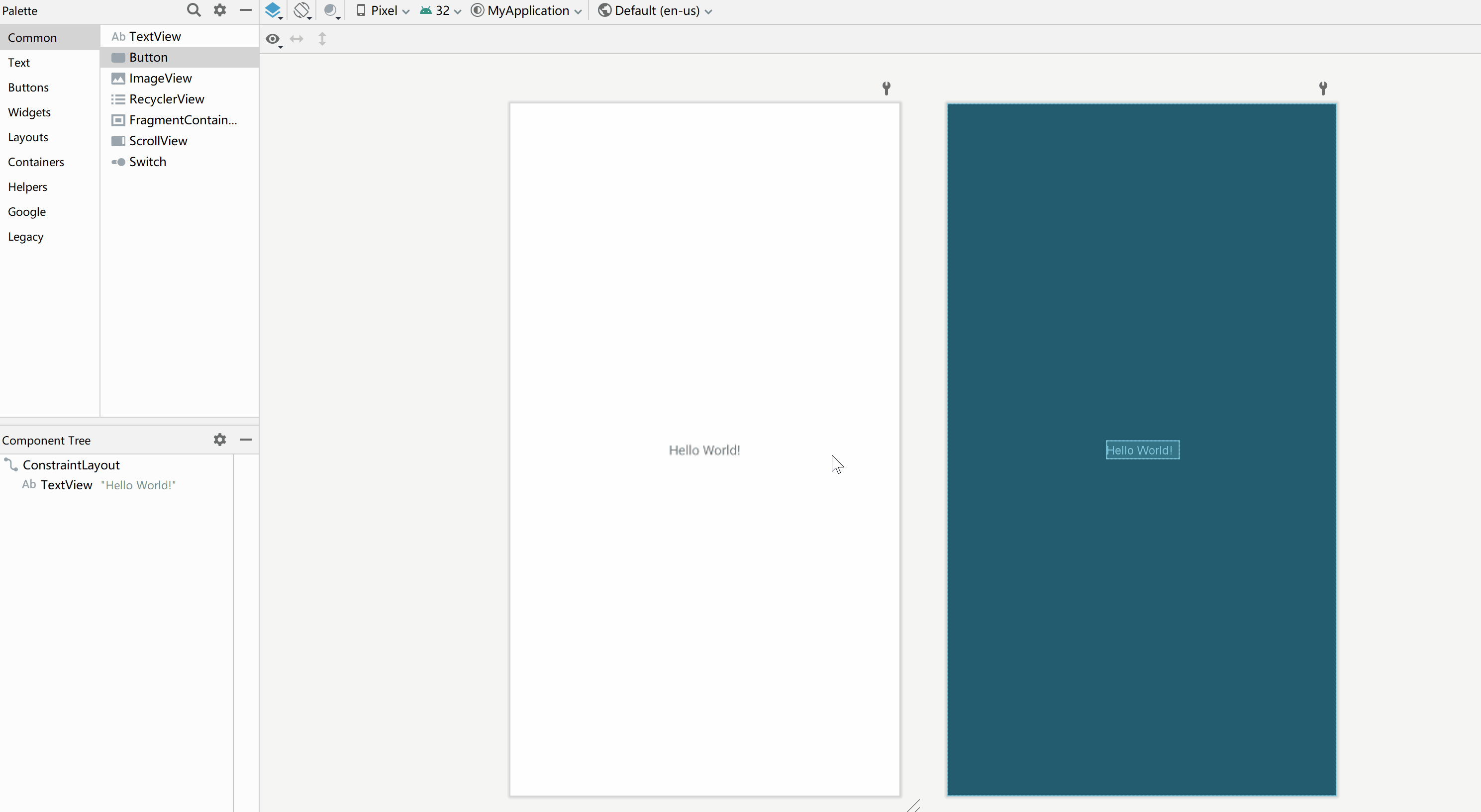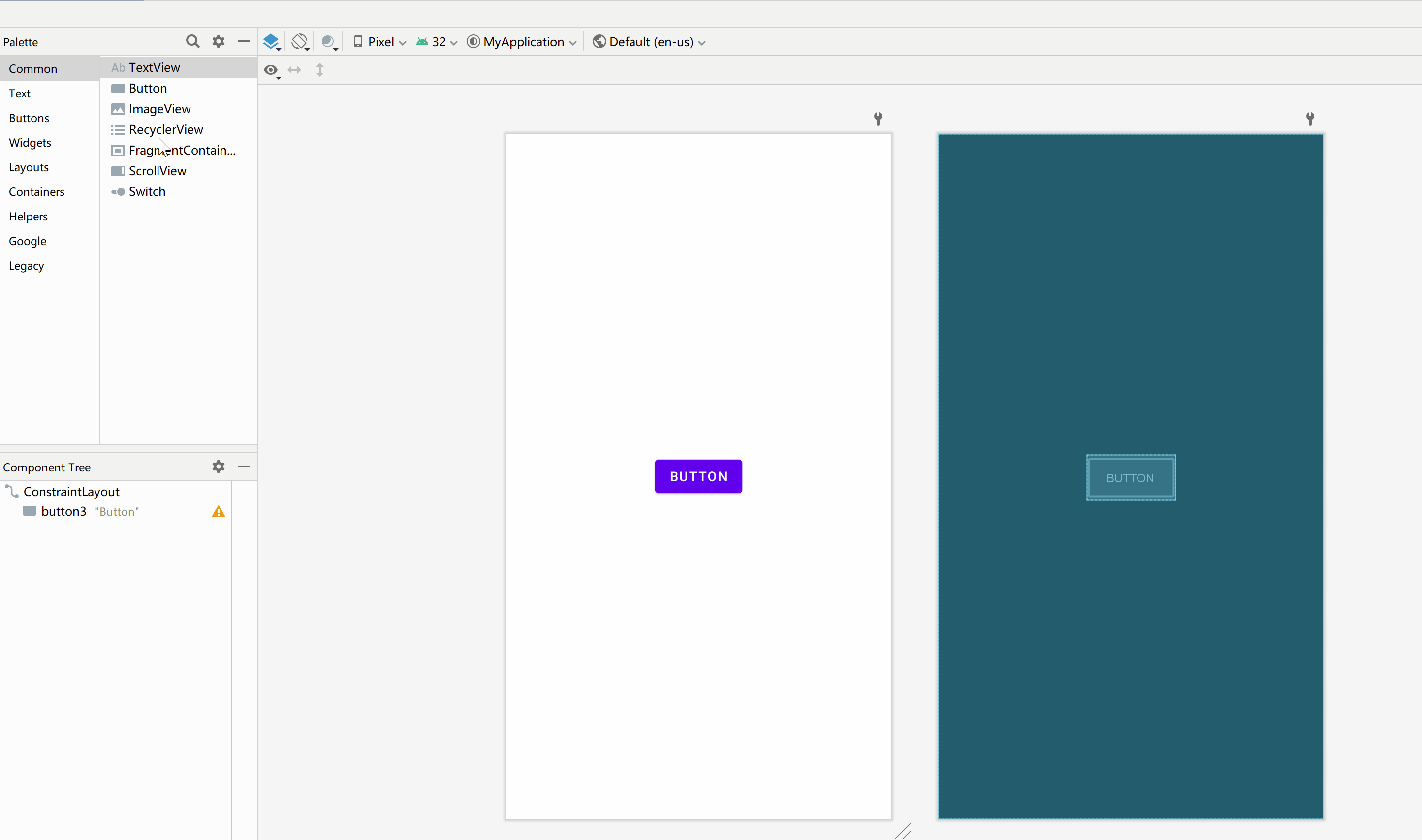 在Android Studio中默认的布局方式是约束布局,在约束布局中添加控件非常简单,只需要从左侧的Palette