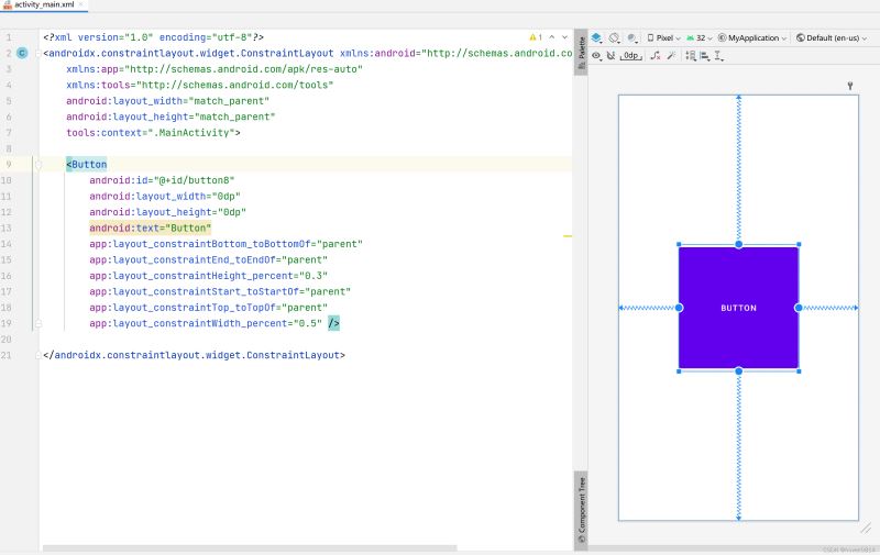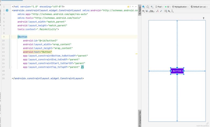 用可视化区域来编写布局虽然比较简单,但是对于一些布局的微调用xml代码会更快,要熟练掌握约束布局,学会用xml代码来编写约束布局也是必备的技能。