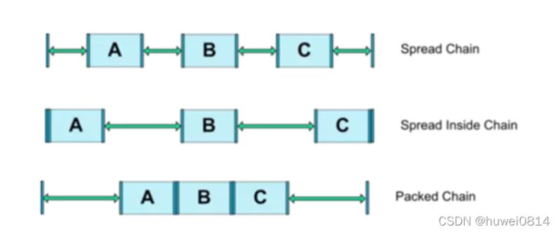 对父控件的剩余空间有三种分配方式,即Spread、spread inside、packed,默认值是Spread即将控件包括第一个控件和最后一个两边均匀分配