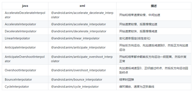 插值器(TimeInterpolator) 表示的是整个动画期间动画的变化规律,如加速、减速等。