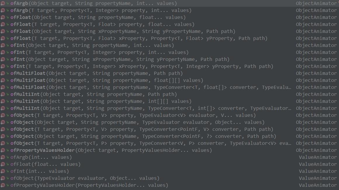 ObjectAnimator 提供了很多的 ofXxx() 方法来方面设置属性动画,如下图所示: