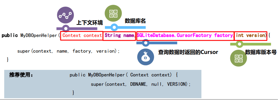 SQLiteOpenHelper中有三个构造方法可供重写,一般使用参数少点的那个构造方 法即可,必须要有它才能对数据库进行操作,这个构造方法中,接受4个参数: